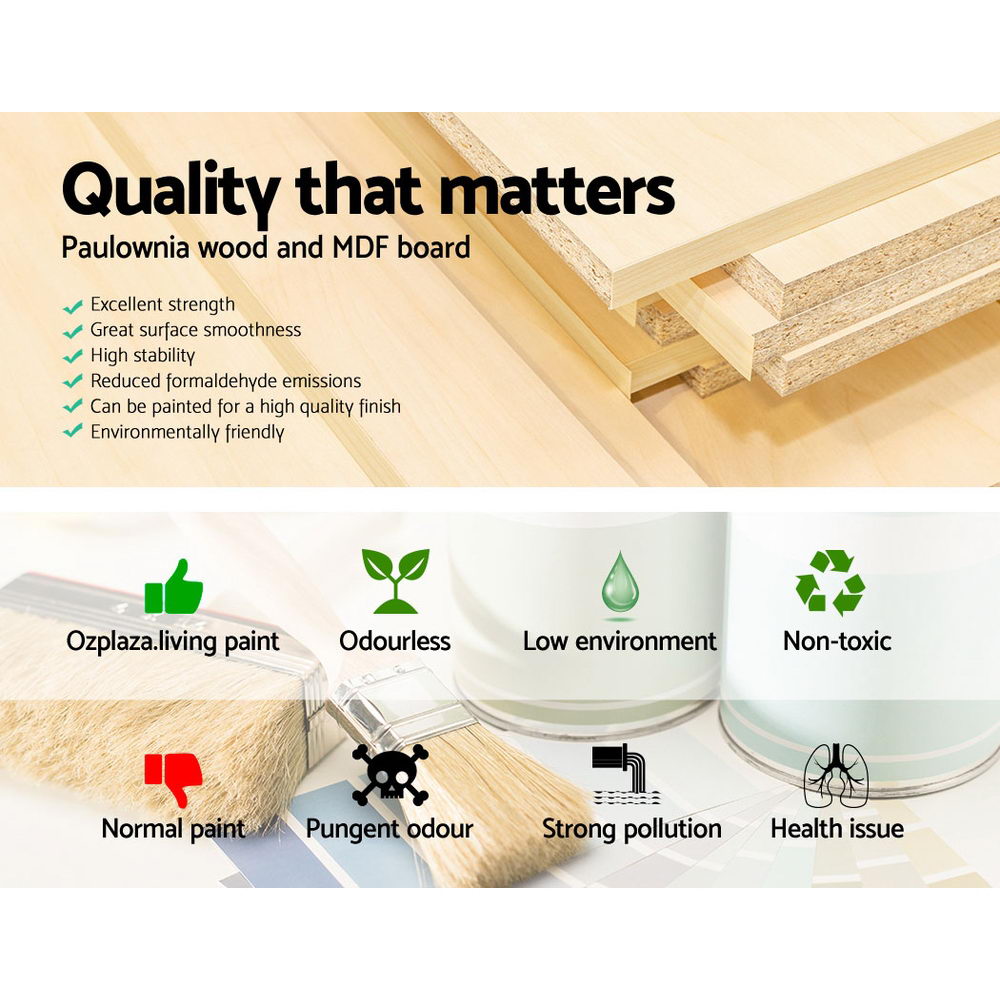 With its vintage chic, our Artiss Sage Bedside Table is as stylish as it is practical. The 18cm thickness Paulownia wood and MDF construction ensure that the furniture piece is able to withstand daily robust use. The drawers are deep and run smoothly. Use it in any space or in any room where the convenient and compact drawers will do wonders to your storage needs. Finished in an eco-friendly non-toxic paint, the ensemble also includes antique-inspired handles, a neat backing and anti-scratch feet pads.