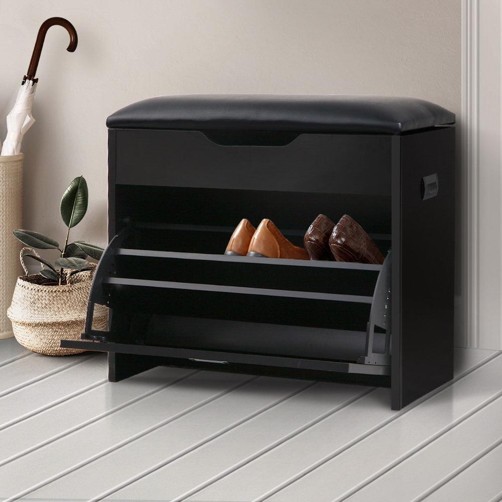 Get yourself a shoe cabinet with an aesthetic difference. Our Artiss Shoe Cabinet Bench adds a touch of luxury and multi-functionality to the ubiquitous shoe cabinet. On first impression, it looks just like a plush PU leather stool. Pull down the front panel and you find three tiers of adjustable shoe shelves with ample space for up to 15 pairs of various footwear. There is also a closed storage compartment hidden under the seat, with cut-out handles for easy opening. Made from quality particle board, the bench is sturdy and finished in melamine for durability and easy maintenance. Not least, its thoughtful design means that you can place it in your hallway or entrance for a neat and tidy look that blends seamlessly with your home decor. So remove the clutter and get organised with our shoe cabinet bench. We are sure it will feet right in with your discerning taste for all things stylish and chic.