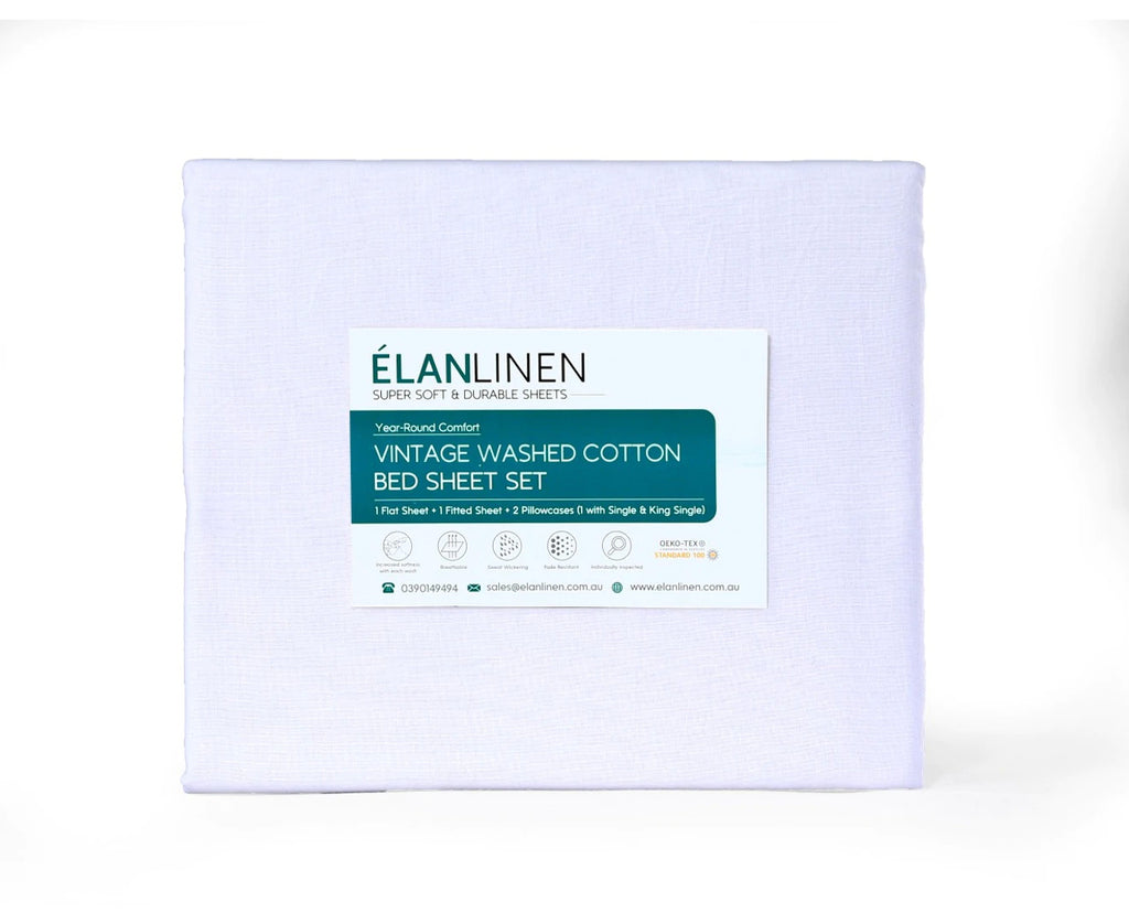 Elan Linen 100% Egyptian Cotton Vintage Washed 500TC White King Bed Sheets Set