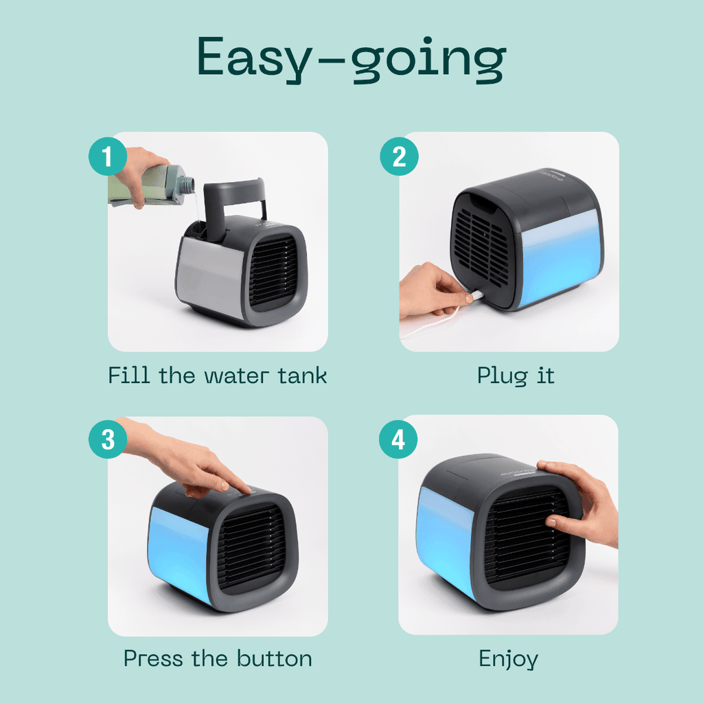 NATURAL PERSONAL COOLING – Efficiently cools your personal space by 5-14°C blowing nice cool breeze. Ideal solution for hot, dry climates. Contrary to personal air conditioners, evaCHILL doesn't use Freon-like liquids, the temperature drop is a result of the water evaporation process.