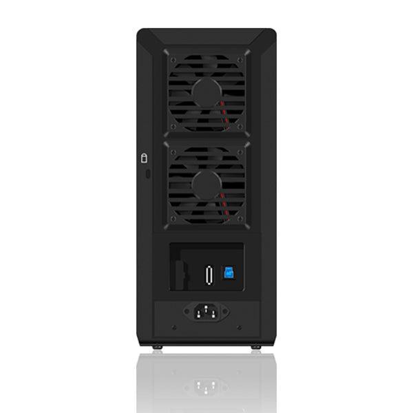 The external JBOD enclosure can accommodate a total of eight SATA I / II / III hard drives or SSDs. It consists largely of aluminium and is therefore stable and dissipates heat very well. The cooling of the drives is achieved due to two temperature controlled 80mm fan on the back and corresponding air-inlets support below the drive bays on the front. The door of the enclosure can be locked.