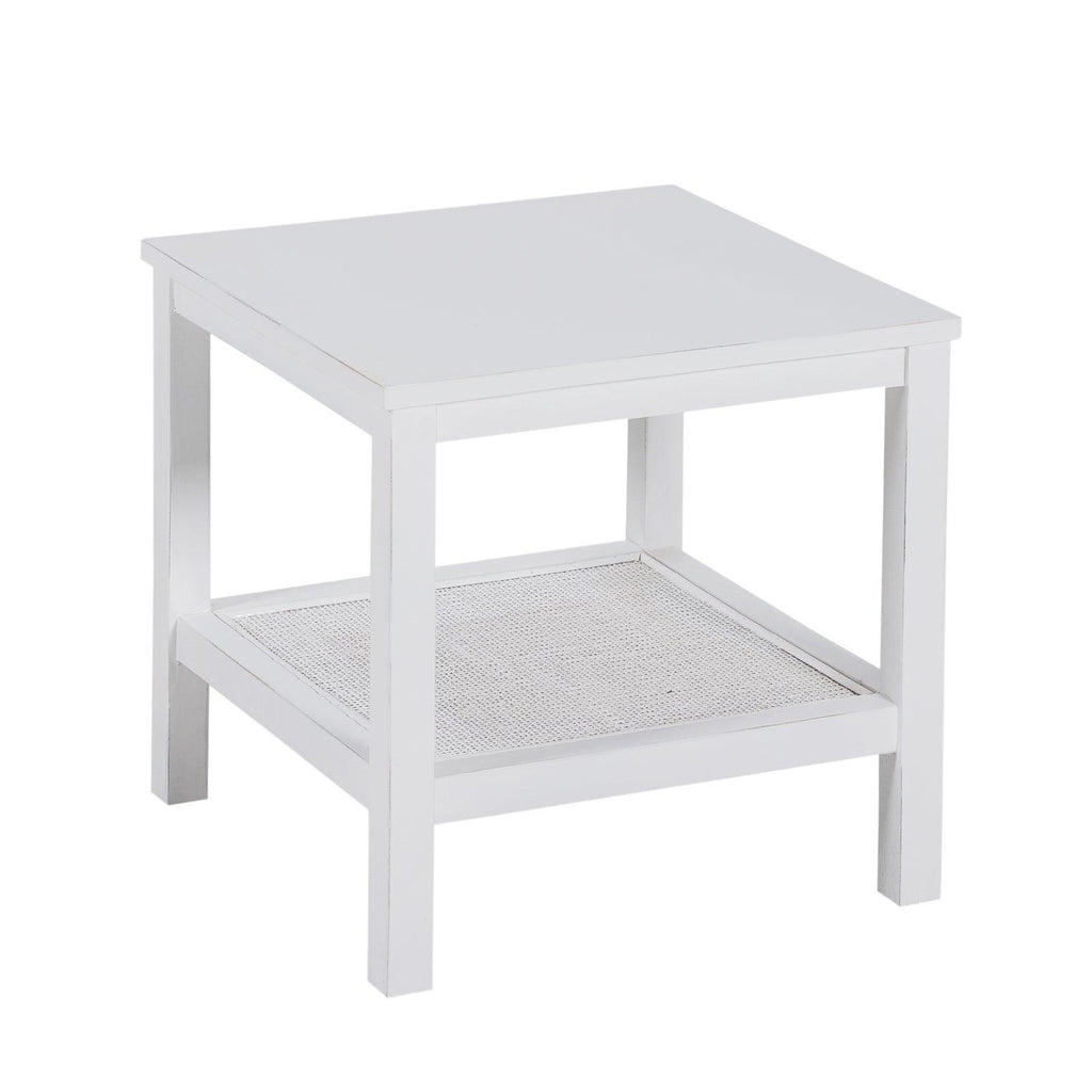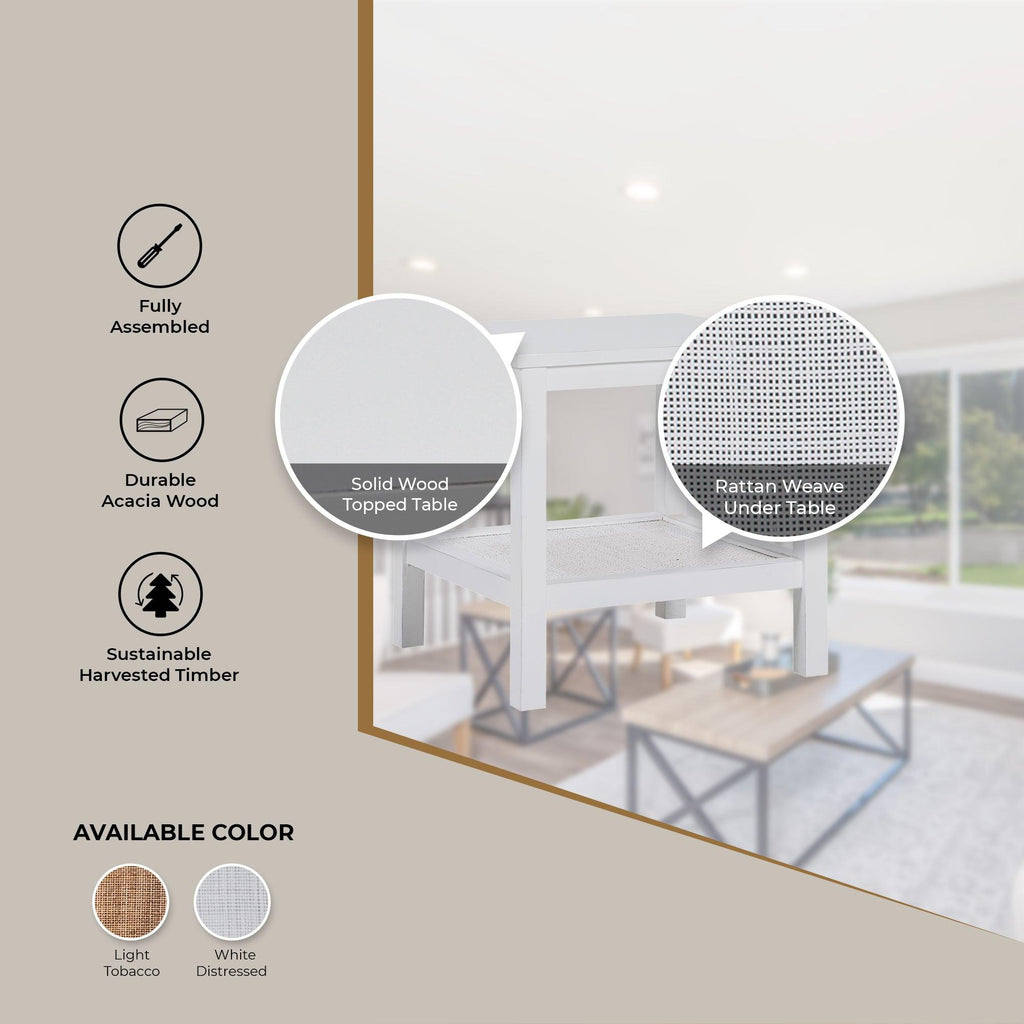 The side table is simply a multi-purpose furniture marvel! It is a table with attractive webbing on the lower part and is made of sustainably harvested solid Mindi wood. The Mindi wood is valued for its strength, longevity, and resistance to deterioration due to mould or moisture.Designed in a Bohemian style, with fibrous whiskers, bumps, slight cracks etc. as natural features, this small piece of furniture brings a sense of coziness and warmth to your living room. The distressed white finish makes the table suitable to complement diverse interior decor styles or furniture pieces. The fully assembled table comes with a one-year warranty.