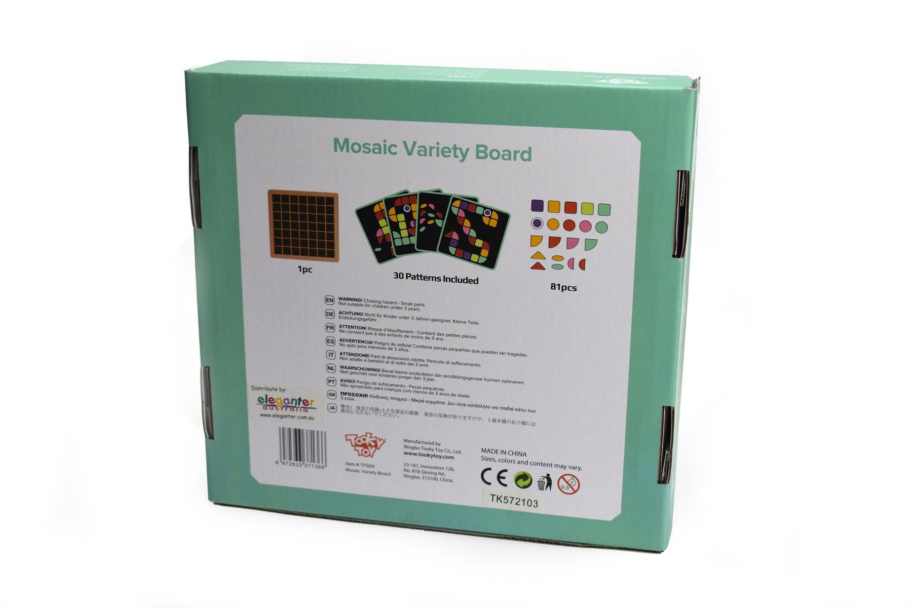 Specification:Board size approx 21.5cmLx 21.5cmWx 1cmH. Pattern card size approx 17.5cmLx 17.5cmW. Each set comes with 81 coloured wooden tiles, 15 cards, mosaic tray and fabric bag. Each wooden tile is approx 2.4cm x 2.4cm and fits in the tray with holes 2.5cm x 2.5cm