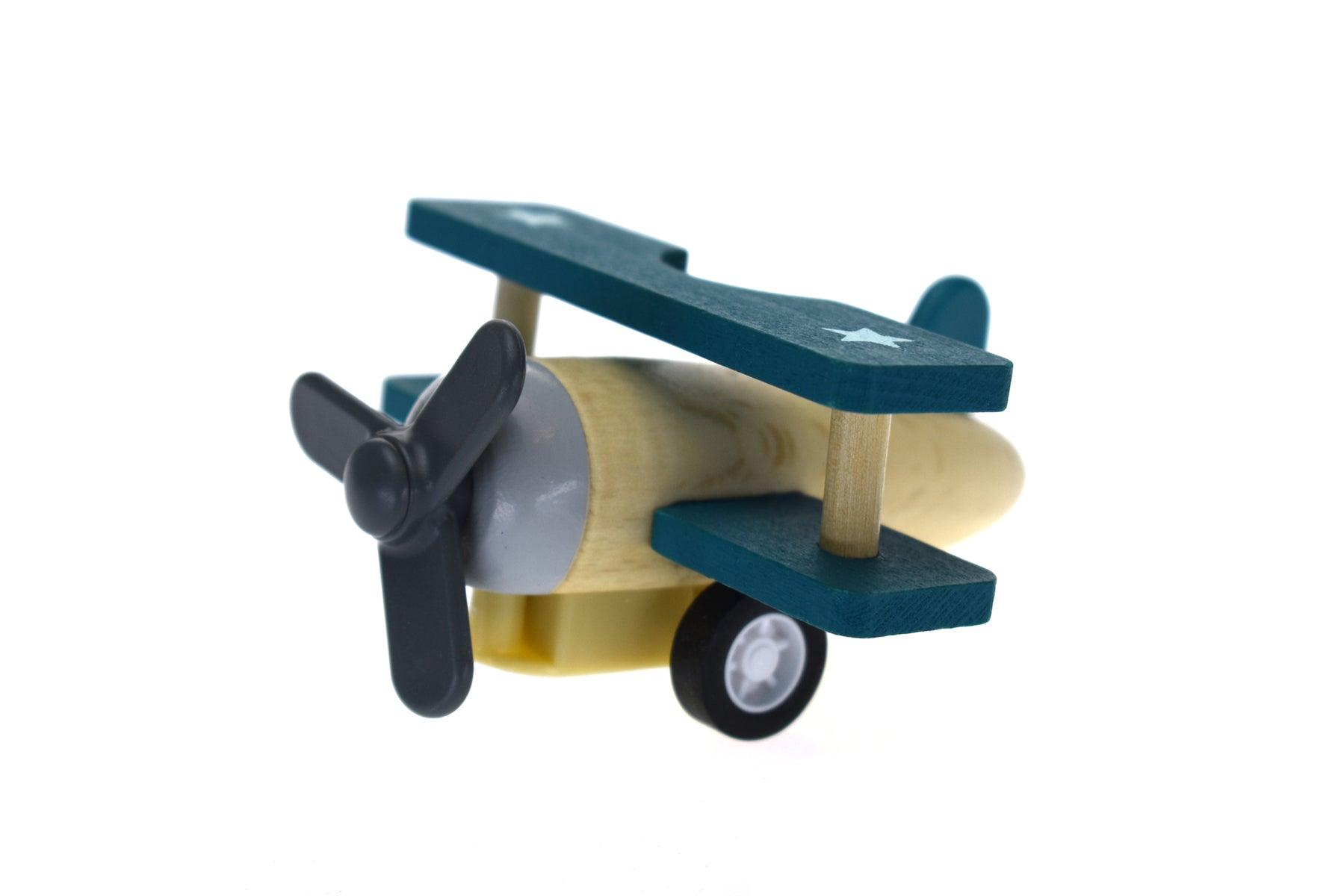 Retro replica wooden bi-plane with a pull back motor and rubberised wheels. Pull them back and let go - watch them zoom along the floor. So much fun for the vintage airplane enthusiast.