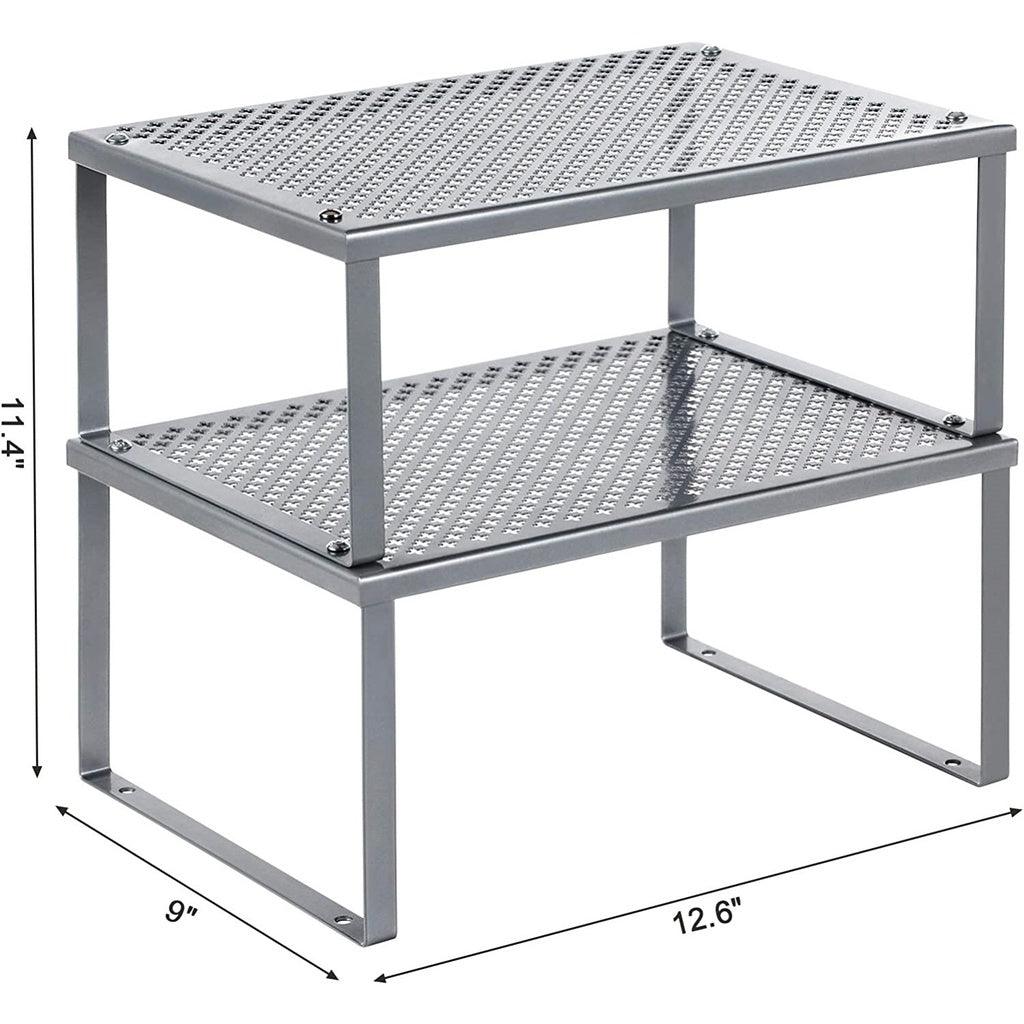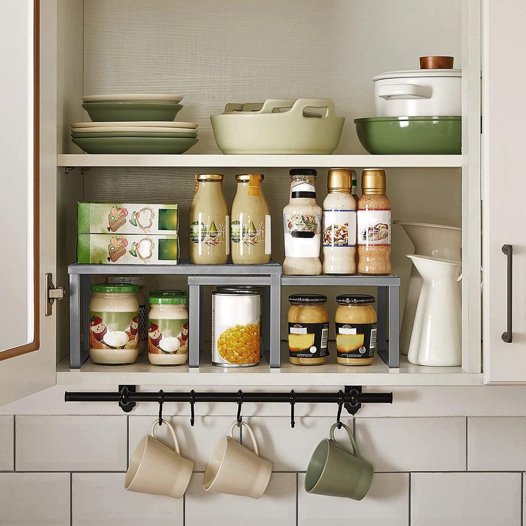 Put them in the cabinet or on the counter to create more levels and more stacking options for boxed grains, spice bottles, glasses, bowls and more. You can never have too many storage shelves in the kitchen, right